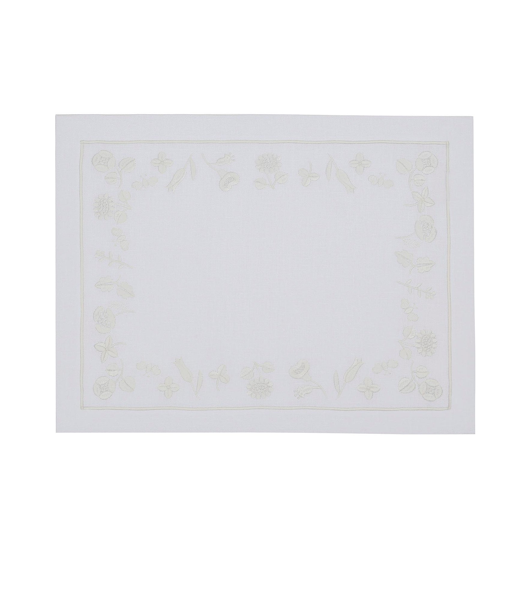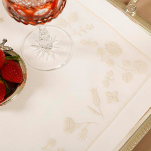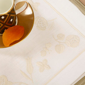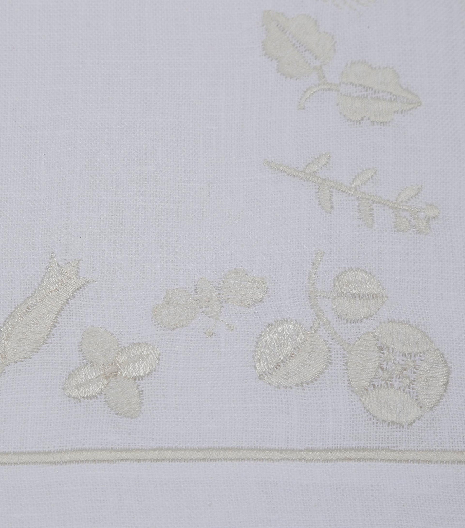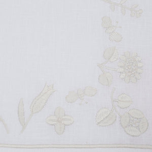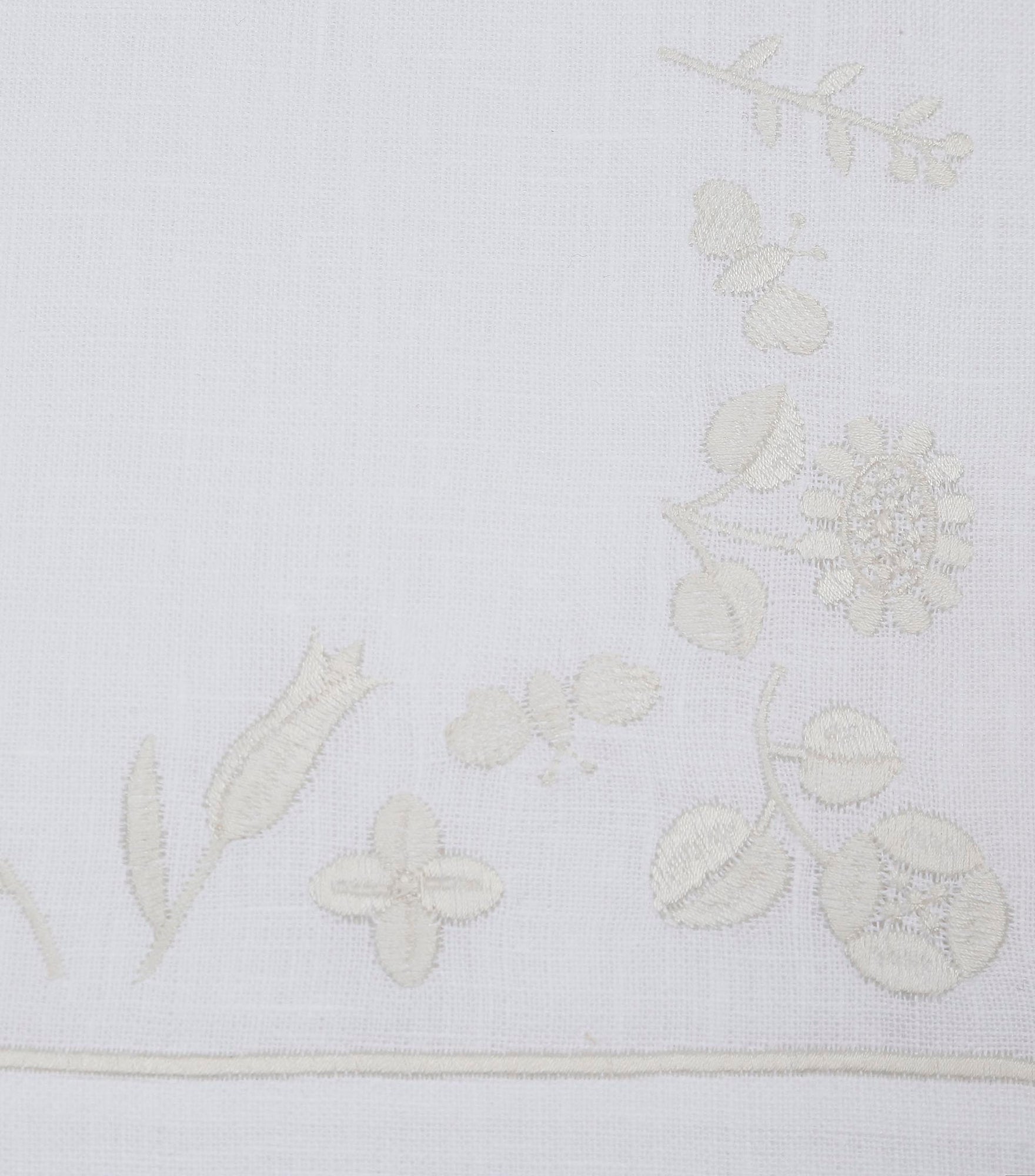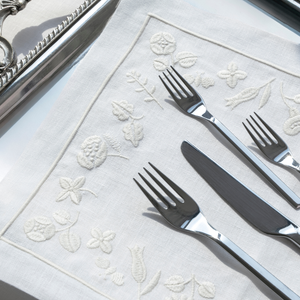 Inspired by quiet floral forms, this design reflects nature’s softness through graceful embroidered blooms. Crafted from 100% Italian linen and finished with fine hand embroidery, the set feels light, calm, and inviting. Subtle hemstitch detailing completes the refined look.