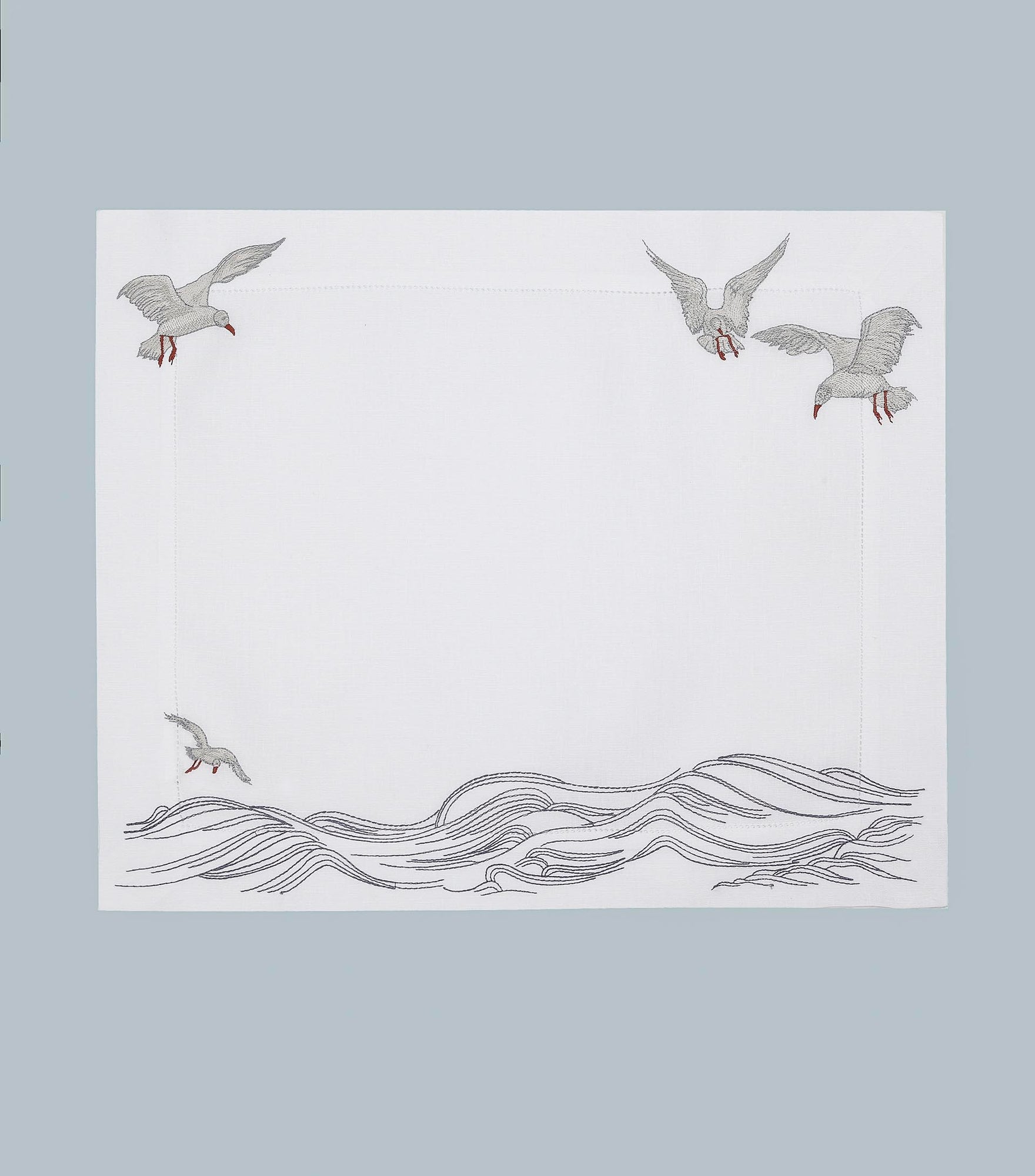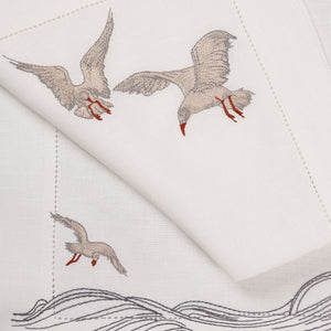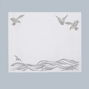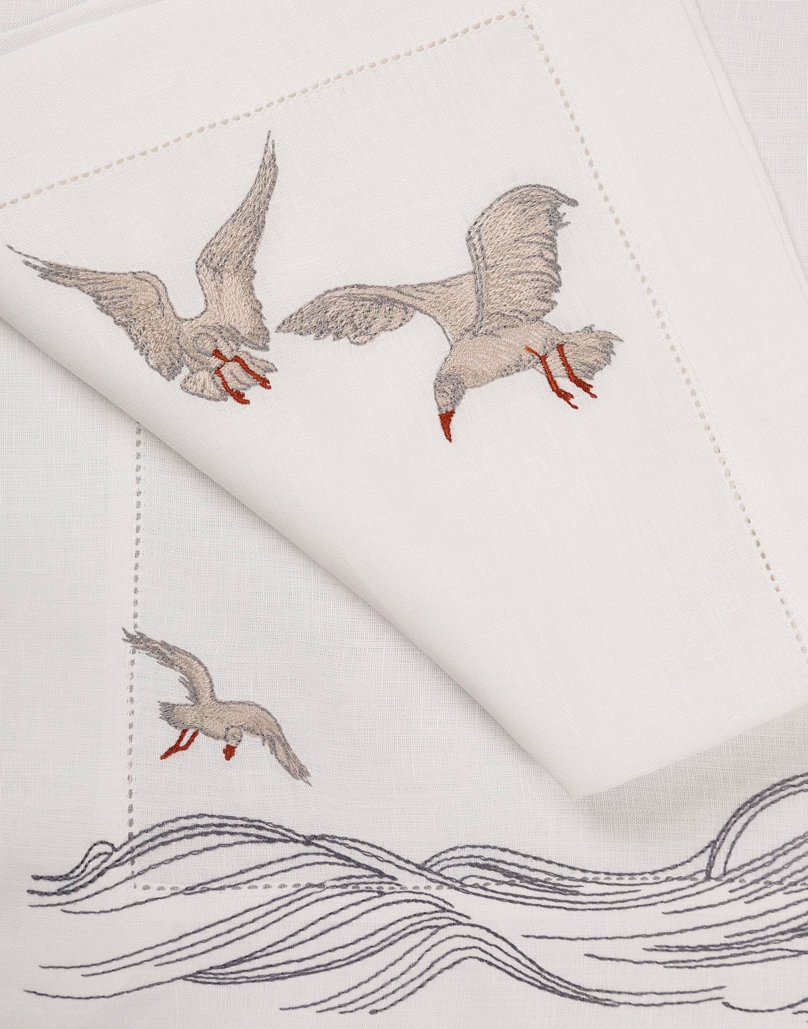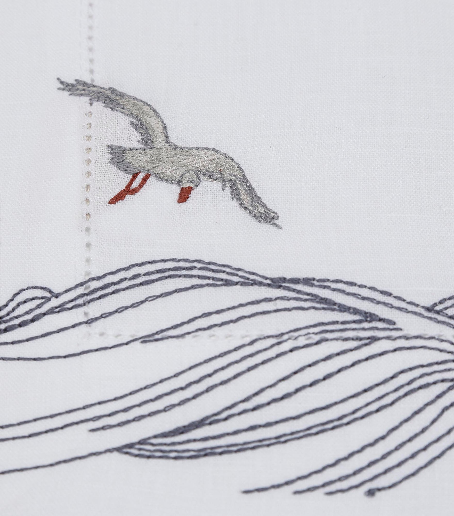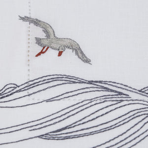 Inspired by the quiet waves of the creek and seagulls gliding above the water, this design captures a sense of peaceful motion. Crafted from 100% Italian linen and finished with fine hand embroidery, the flowing lines reflect the rhythm of life along the creek. Hemstitch detailing completes the refined look.
