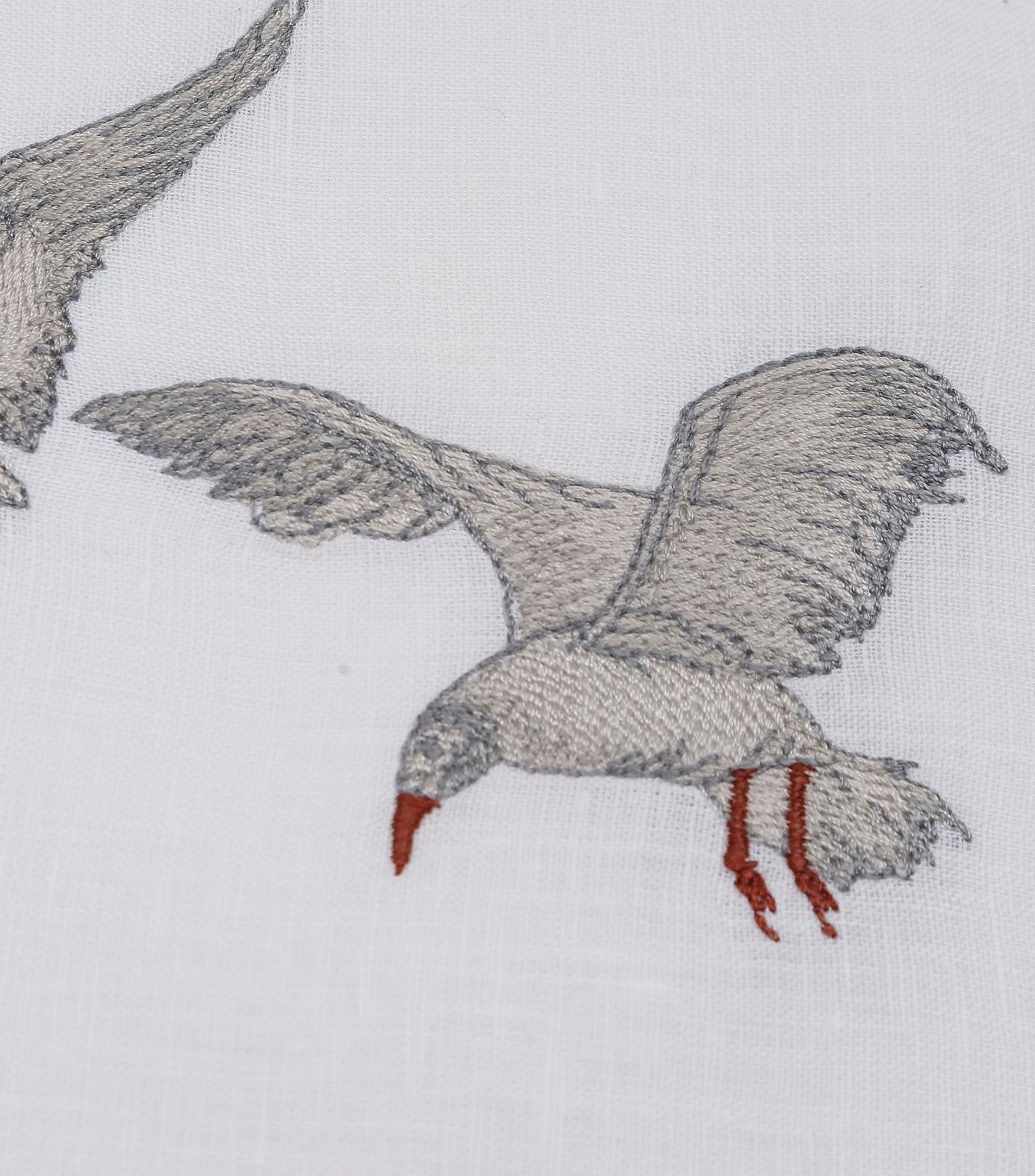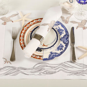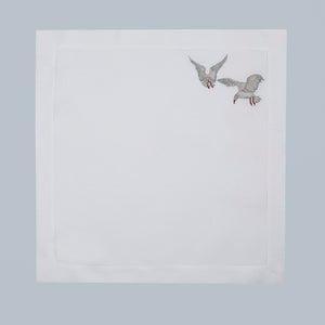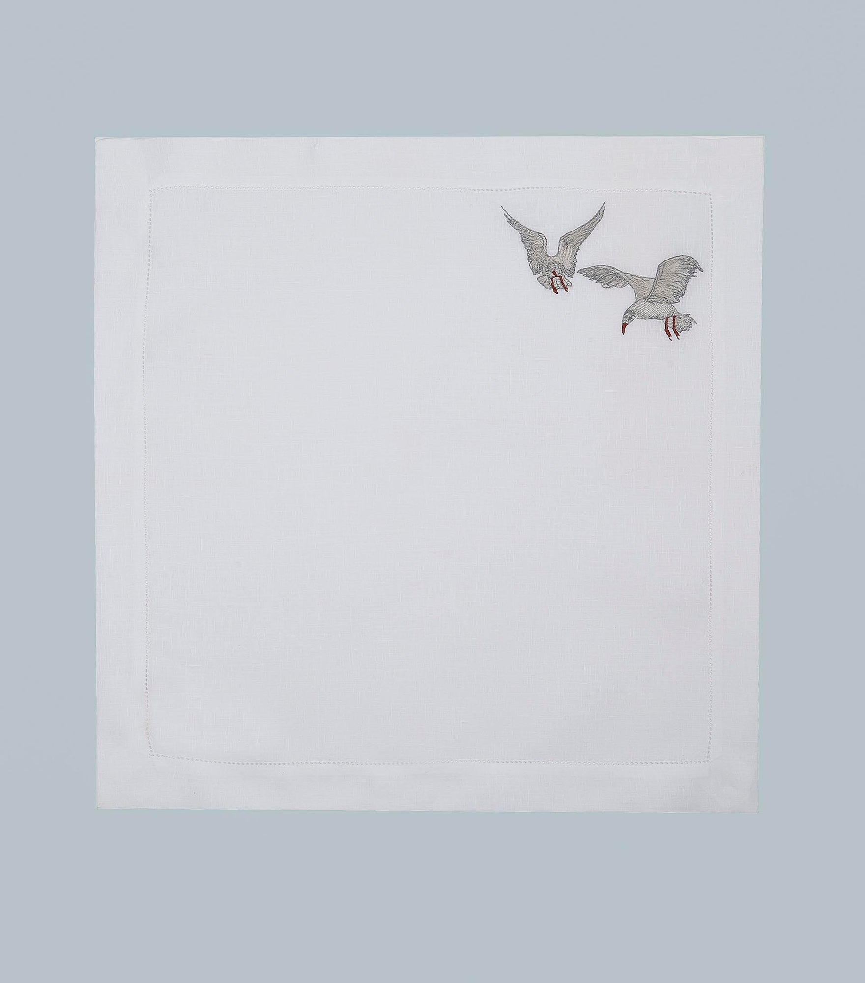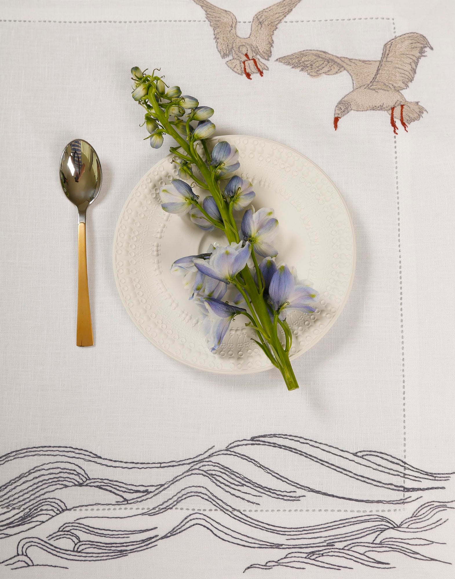 Inspired by the quiet waves of the creek and seagulls gliding above the water, this design captures a sense of peaceful motion. Crafted from 100% Italian linen and finished with fine hand embroidery, the flowing lines reflect the rhythm of life along the creek. Hemstitch detailing completes the refined look.