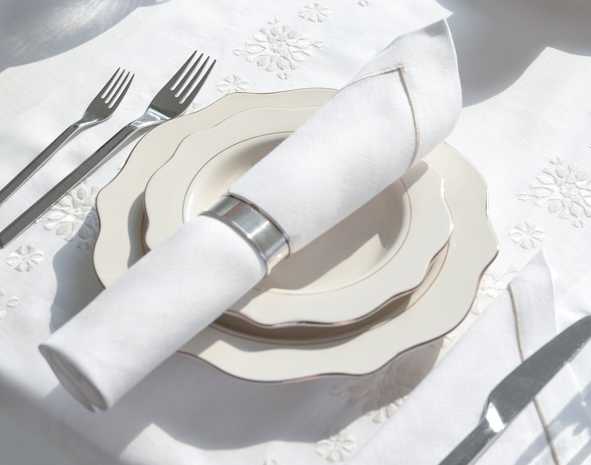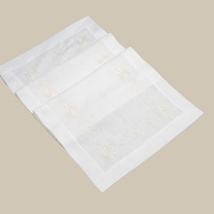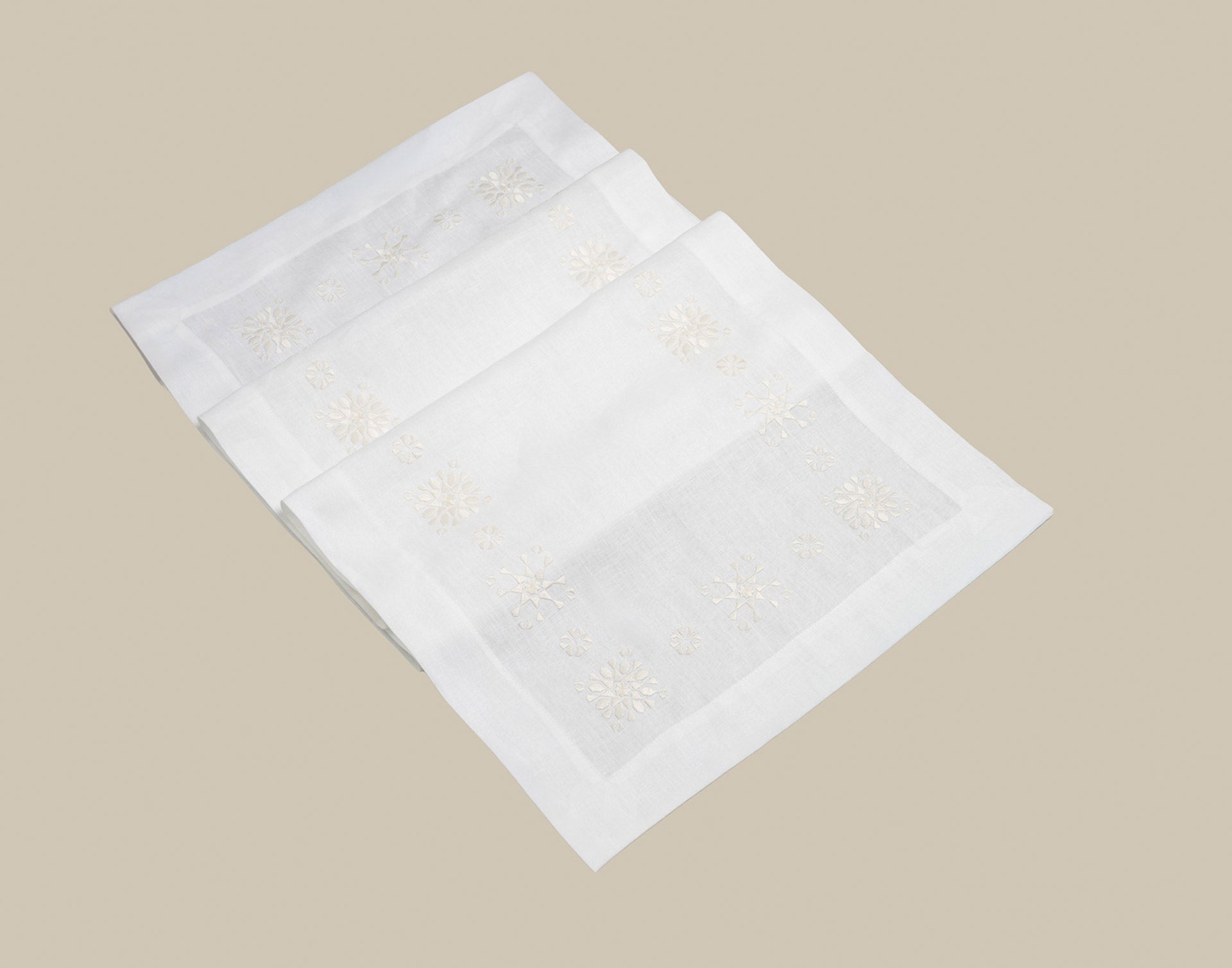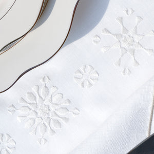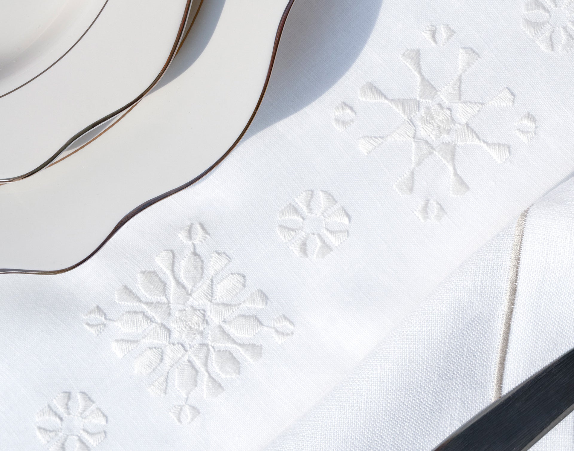 Inspired by geometric mosaic patterns, this design features subtle star-like motifs arranged with gentle symmetry. Crafted from 100% Italian linen and finished with fine hand embroidery, the pattern feels light, structured, and understated. The refined detailing adds depth without overwhelming the table.