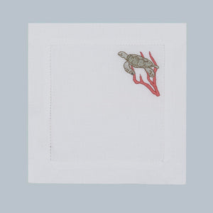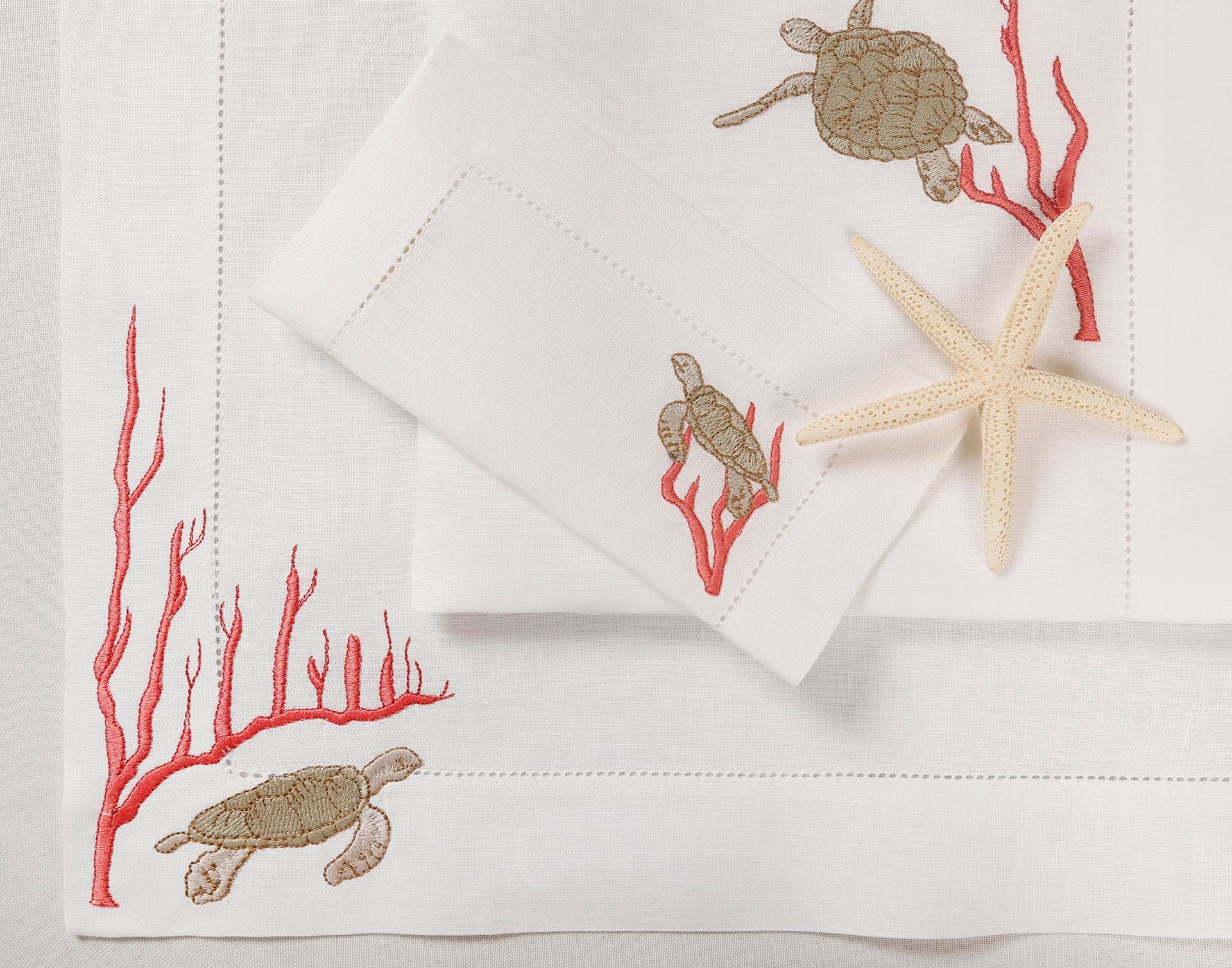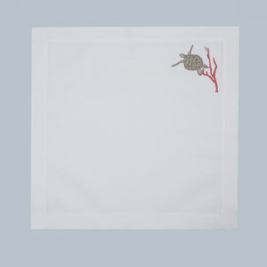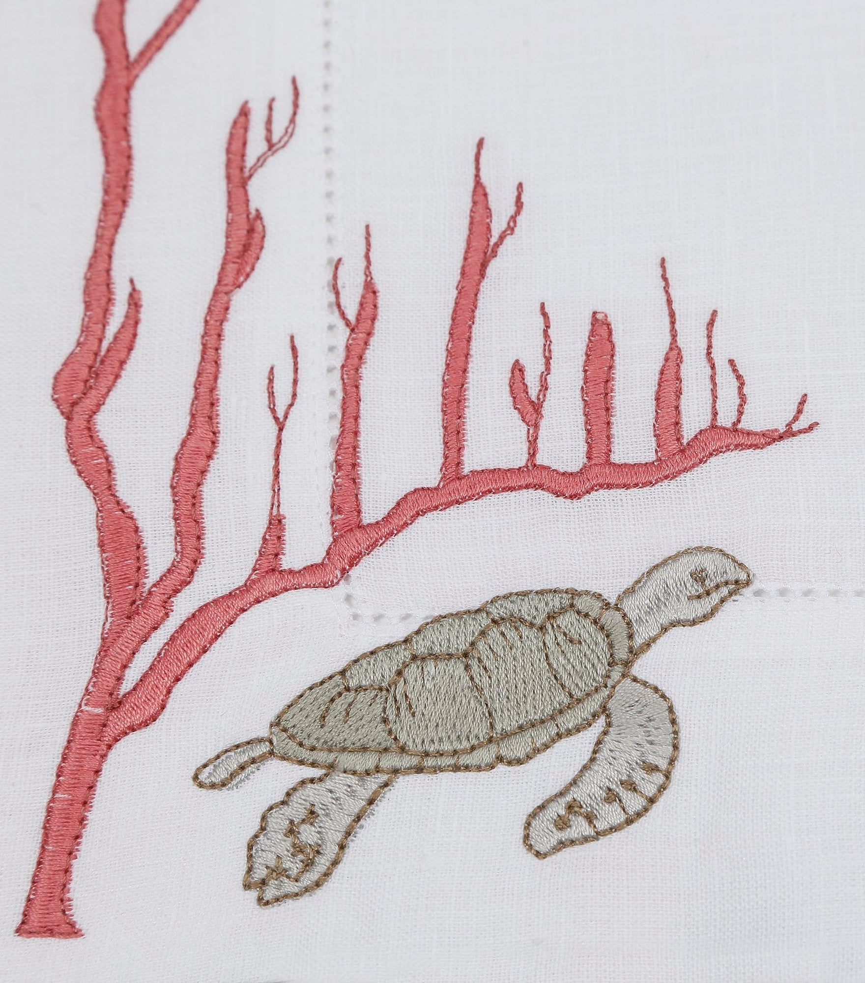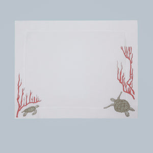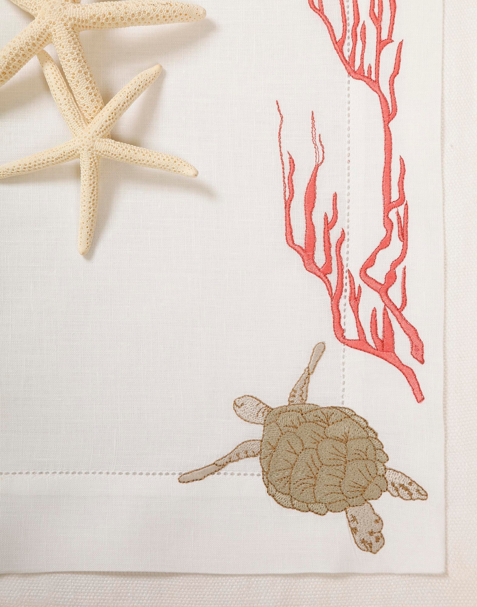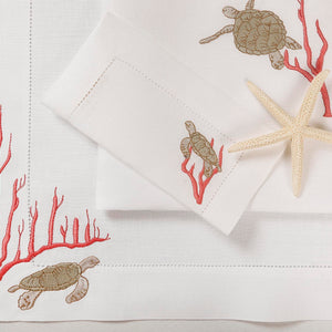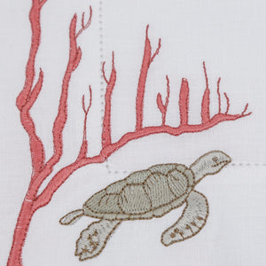 Inspired by sea turtles and coral reefs, this design reflects the quiet beauty of marine life. Crafted from 100% Italian linen and finished with fine hand embroidery, the organic motifs echo underwater movement and texture. Subtle hemstitch detailing adds refinement without distraction.